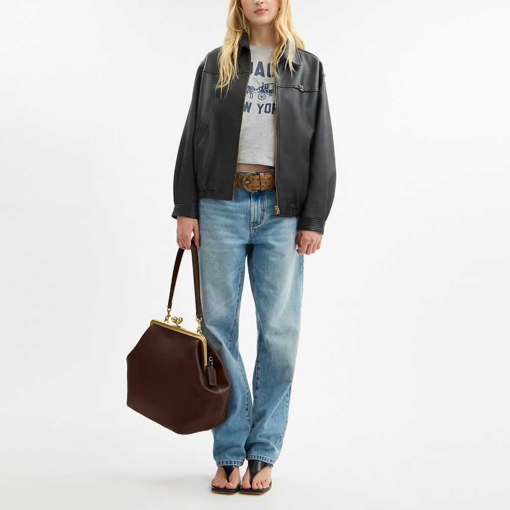 The Large Kisslock Frame Bag is based on the "Cashin Carry" from 1969, an archival style . Reimagined as a spacious carryall, this buttery soft glovetanned leather silhouette features our iconic kisslock closure inspired by vintage coin purses, an inside zip pocket to organize essentials and a detachable leather strap for crossbody wear.